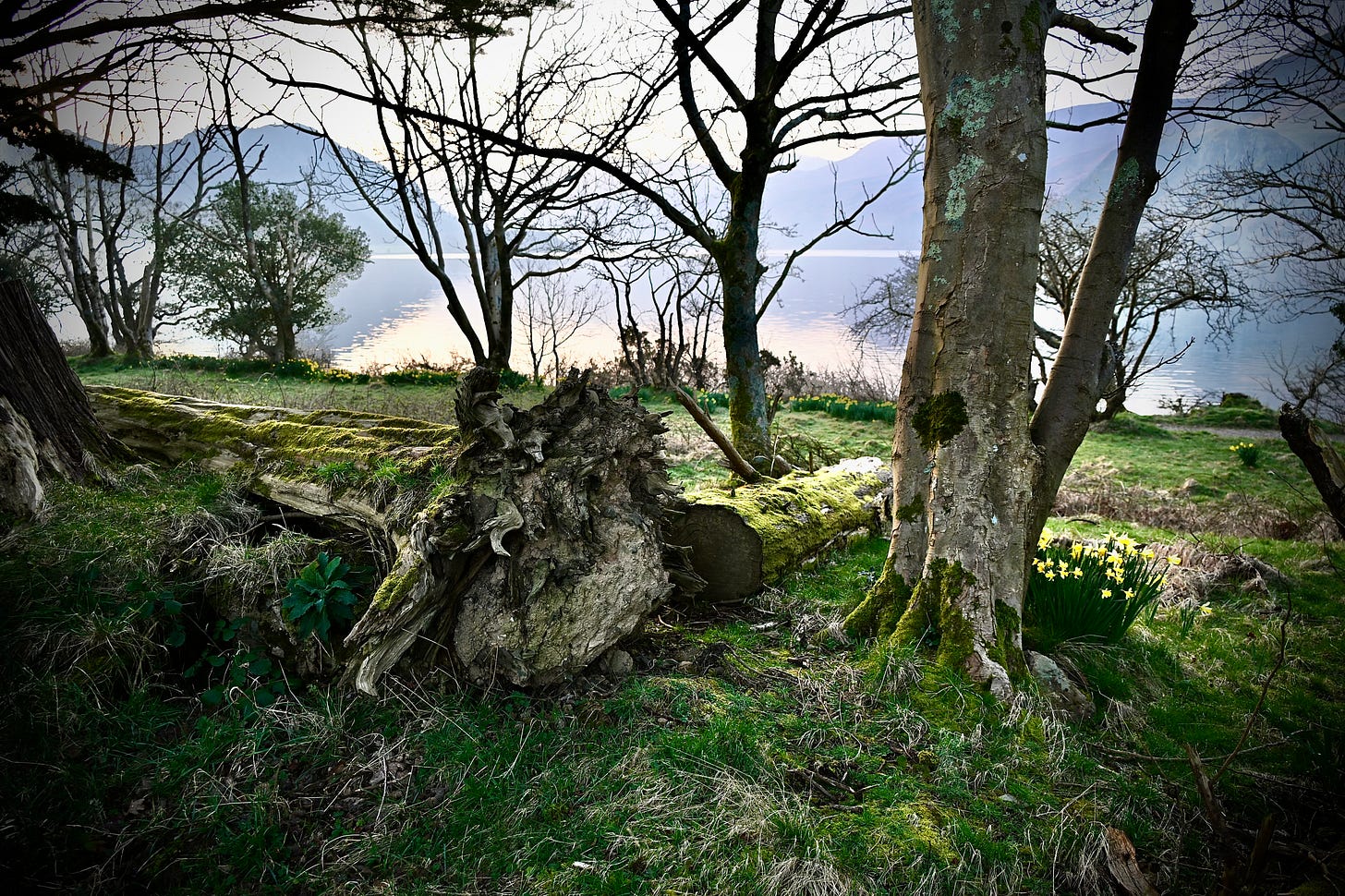 Scattered around what used to be the hotel’s once-beautiful gardens – along with two large broken boughs at the edge of the lake – are several massive fallen ones, though. (It seems that Buttermere isn’t the only place that has suffered in recent storms.) Spring is most definitely sprung, however – daffodils surround me, echoed by the gorse bushes that proliferate along this north-western shore.