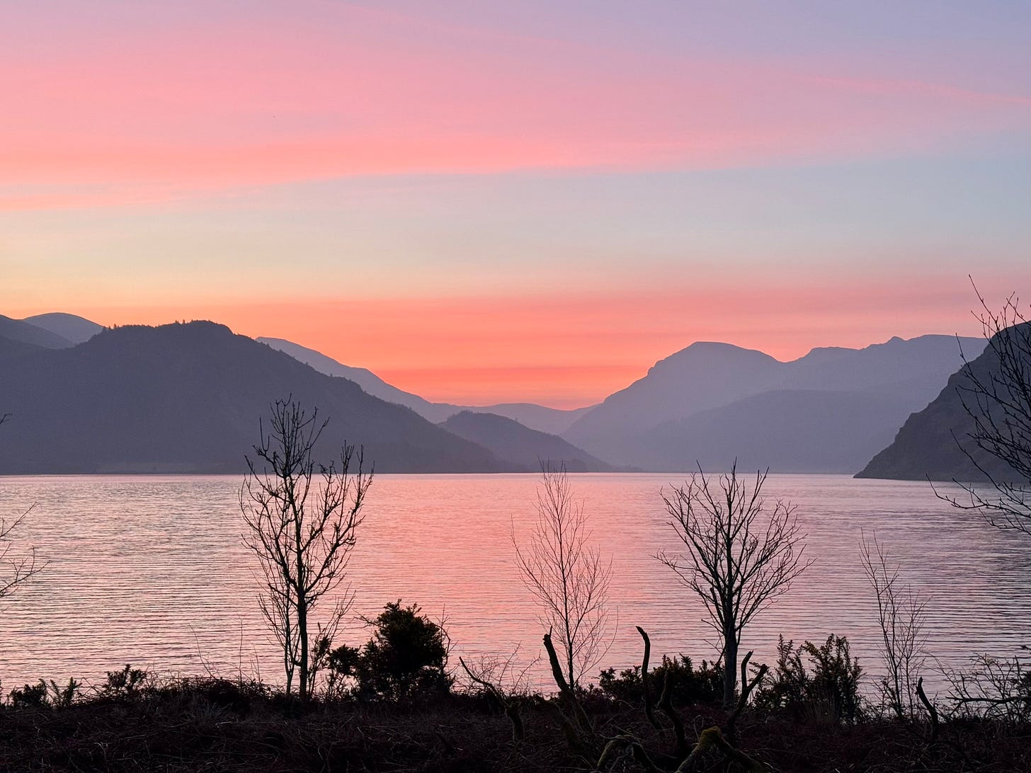 There have been robins, song thrushes, blackbirds and wrens accompanying me ever since I arrived; but now they are joined by the odd quack from a handful of mallards – although I also spot two pairs of tufted ducks – and honking from several greylag geese. The only other sound is water. After one of the wettest winters I remember, there is just so much of it contained in the land around Ennerdale that all the streams are at full spate, and the ground either side of the path is extremely squelchy (where it isn’t frozen). There is little breeze, however: and the trees stand preternaturally still.